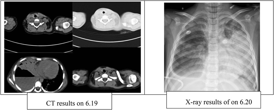 A 7-year-old girl was admitted to the hospital on June 12 with a history of cough lasting more than 20 days and intermittent fever for 20 days. On June 19, due to clinical deterioration, she was transferred from the Respiratory Ward to the Pediatric Intensive Care Unit (PICU). At admission to the PICU, her vital signs were as follows: body temperature 39°C, heart rate 178 beats/min, respiratory rate 55 breaths/min, oxygen saturation 88%, and blood pressure 90/64 mmHg. She exhibited severe respiratory distress with dyspnea, cyanosis of the lips, and evident suprasternal and intercostal retractions. Endotracheal intubation was performed immediately for ventilatory support. Physical examination revealed slightly cool extremities with capillary refill time of 2.5–3 s. Cardiac auscultation detected strong heart sounds with a regular rhythm, without murmurs at either the apex or base. Neurological assessment showed bilaterally equal pupils with sluggish light reflexes, and her Glasgow Coma Scale (GCS) score was 8.