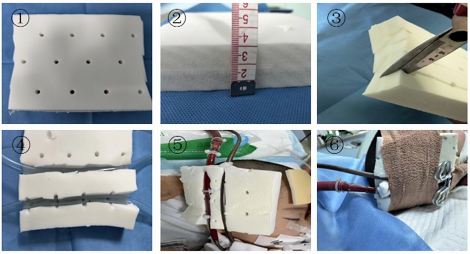Figure 2. Improved latex pad with elastic bandage. (1) Latex pad. (2) The latex pad is 3 cm thick. (3) Cut the latex pad from the middle, taking care not to cut all the way through. (4) Latex pad after cutting. (5) Embed the ECMO tubing into the latex pad. (6) Secure the latex pad and catheter with an elastic bandage.
