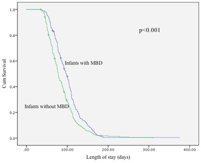 Figure 1. Kaplan–Meier curve for length of stay of infants with and without MBD.