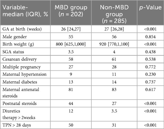 Table 1 summarizes the demographic and clinical characteristics of infants with and without MBD. The median gestational age at birth was lower in the MBD group compared to the non-MBD group [26 weeks (IQR 24–27) vs. 27 weeks (IQR 26–28); p < 0.001]. Similarly, the MBD group had a lower birth weight [800 g (IQR 625–1,000) vs. 920 g (IQR 770–1,100); p < 0.001]. There were no significant differences between the MBD and non-MBD groups in terms of male gender distribution [55% vs. 56%; p = 0.854], small-for-gestational-age status [3.5% vs. 4%; p = 0.438], cesarean delivery [58% vs. 61%; p = 0.538], multiple pregnancy [27% vs. 28%; p = 0.772], maternal diabetes [13% vs. 14%; p = 0.737], [800 g (IQR 625–1,000) vs. 920 g (IQR 770–1,100); p = 0.737], antenatal steroid exposure [81% vs. 83%; p = 0.617], or maternal hypertension [9% vs. 11%; p = 0.230]. Postnatal steroid use was more frequent in the MBD group [44% vs. 27%; p < 0.001]. Use of diuretics for more than two weeks was higher in the MBD group [12% vs. 3.5%; p < 0.001], as was prolonged parenteral nutrition exceeding 28 days [50% vs. 31%; p < 0.001] (Table 1).