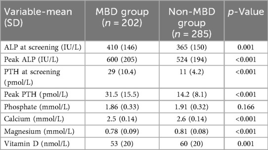 Table 2 presents a comparison of biochemical parameters between infants with and without MBD. Infants in the MBD group had significantly higher ALP levels at screening [410 IU/L (SD 146) vs. 365 IU/L (SD 150); p = 0.001] and higher peak ALP levels [600 IU/L (SD 205) vs. 524 IU/L (SD 194); p < 0.001]. Both screening and peak PTH concentrations were markedly elevated in the MBD group [29 pmol/L (SD 10.4) vs. 11 pmol/L (SD 4.2); p < 0.001 and 31.5 pmol/L (SD 15.5) vs. 14.2 pmol/L (SD 8.1); p < 0.001, respectively]. Serum phosphate levels were not significantly different between groups [1.86 mmol/L (SD 0.33) vs. 1.91 mmol/L (SD 0.32); p = 0.166]. However, infants with MBD had significantly lower serum calcium [2.5 mmol/L (SD 0.14) vs. 2.6 mmol/L (SD 0.14); p < 0.001] and magnesium levels [0.78 mmol/L (SD 0.09) vs. 0.81 mmol/L (SD 0.08); p < 0.001], as well as lower vitamin D concentrations [53 nmol/L (SD 20) vs. 60 nmol/L (SD 20); p = 0.001] (Table 2).