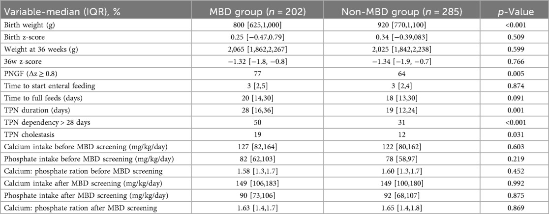 Comparisons between infants with and without MBD were performed using independent samples t-tests for normally distributed variables and Mann–Whitney U-tests for non-normally distributed variables. Categorical variables were compared using the Chi-square test or Fisher's exact test, as appropriate. Changes in weight-for-age z-scores from birth to 36 weeks of postmenstrual age were calculated using the Fenton growth chart, and PNGF was defined as a decline in z-score of ≥0.8 during this interval.