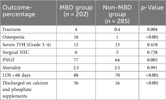 The incidence of PNGF was significantly higher in the MBD group [77% vs. 64%; p = 0.005], and a greater proportion of infants with MBD experienced prolonged hospitalization, defined as length of stay greater than 60 days [88% vs. 70%; p < 0.001]. Discharge on calcium and phosphate supplementation was also more common among MBD infants [36% vs. 16%; p < 0.001]. There was no difference in overall mortality between the groups [2.5% vs. 2.5%; p = 0.991] (Table 4).