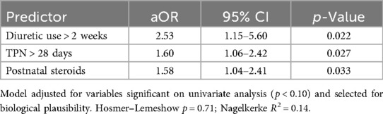 Multivariable logistic regression analysis was conducted to identify independent predictors of MBD among preterm infants (Table 5). Variables with p < 0.10 on univariate analysis and those considered biologically plausible were entered into the model. Three variables remained independently associated with MBD: prolonged diuretic exposure (>2 weeks; aOR: 2.53, 95% CI: 1.15–5.60, p = 0.022), total parenteral nutrition > 28 days (aOR: 1.60, 95% CI: 1.06–2.42, p = 0.027), and postnatal steroid use (aOR: 1.58, 95% CI: 1.04–2.41, p = 0.033). The model demonstrated acceptable calibration (Hosmer–Lemeshow p = 0.71) and moderate explanatory power (Nagelkerke R2 = 0.14). These findings suggest that prolonged exposure to catabolic medications and delayed nutritional autonomy are key risk factors contributing to impaired bone mineralization in this population (Table 5).