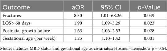 Multivariable logistic regression was performed to examine the association between MBD and major adverse outcomes, with adjustment for gestational age (Table 6). After controlling for gestational age, MBD remained independently associated with a higher likelihood of radiographically confirmed fractures (aOR: 8.30, 95% CI: 1.01–68.26, p = 0.049), prolonged hospitalization exceeding 60 days (aOR: 1.90, 95% CI: 1.09–3.29, p = 0.023), and postnatal growth failure (aOR: 1.63, 95% CI: 1.06–2.53, p = 0.028). Gestational age itself was inversely related to these adverse outcomes, with each additional week of maturity reducing the odds (aOR: 1.25, 95% CI: 1.10–1.42, p = 0.001). The model demonstrated good calibration (Hosmer–Lemeshow p = 0.64). These findings underscore that, even after accounting for prematurity, MBD is an independent risk factor for prolonged hospitalization, poor postnatal growth, and fractures in extremely preterm infants (Table 6).