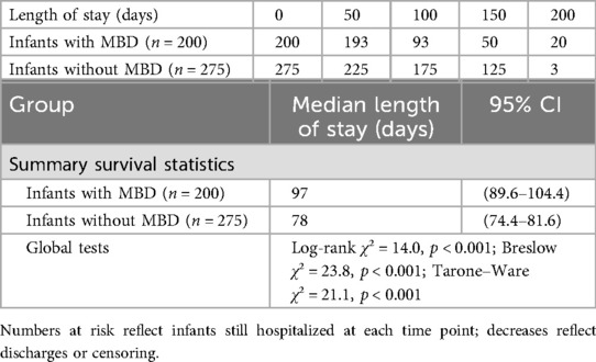 Table 7. Number of infants at risk at selected time intervals and summary survival statistics from the Kaplan–Meier analysis of hospital stay in infants with and without MBD.