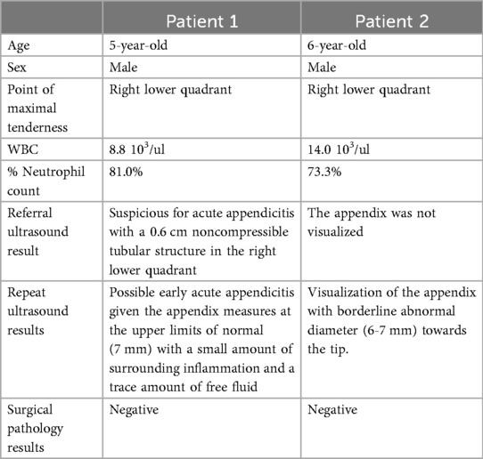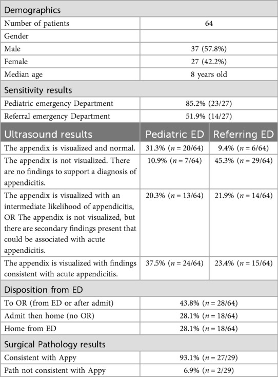 Table 1. Demographics, ultrasound findings, and clinical outcomes in pediatric appendicitis referrals.