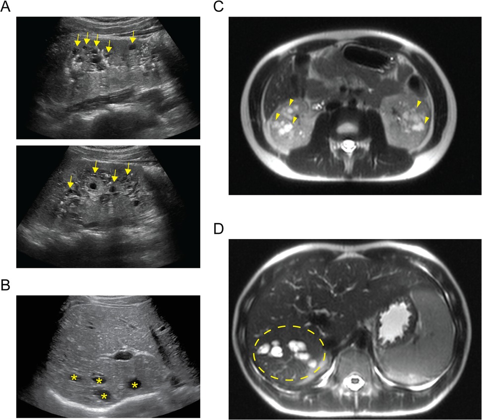 Figure 1. Imaging of cystic organ changes. (A) Sagittal ultrasound images of right (upper) and left (lower) kidneys demonstrating diffuse cystic changes predominantly affecting the medullary parenchyma (examples indicated with yellow arrows). (B) Transverse ultrasound image of the liver demonstrating cystic spaces of varying size affecting the hepatic parenchyma (examples indicated with yellow asterisks). (C) Axial T2-weighted MRI cross section demonstrating extensive kidney cystic changes bilaterally (examples indicated with yellow arrowheads). (D) Axial T2-weighted MRI cross section demonstrating extensive cystic changes within the right hepatic lobe (affected area within area demarcated by yellow dashed ellipse).