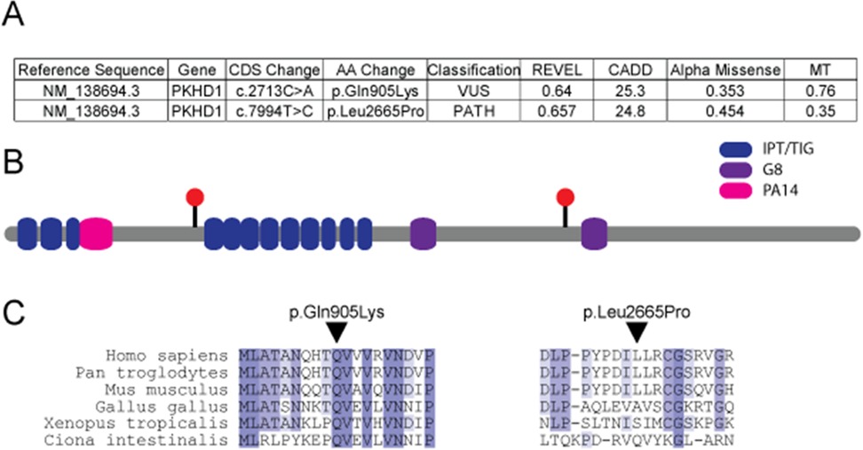 Figure 2. Assessment of identified genetic changes in PKHD1. (A) Table detailing PKHD1 genetic variants observed in the reported individual and in silico predictions of the effects of these variants. Individual metrics were accessed directly from each source. (B) Location of the two missense variants in the context of the protein domains of fibrocystin displayed as red circles. (C) Conservation through phylogeny for the two PKHD1 variants. AA, amino acid; CADD, combined annotation-dependent depletion; CDS, coding sequence; G8, eight conserved glycines; IPT/TIG, immunoglobulin-like fold, plexins, transcription factors/transcription factor immune globin; MT, mutation taster; PA14, protective antigen 14; PATH, pathogenic; REVEL, rare exome variant ensemble learner; VUS, variant of uncertain significance.