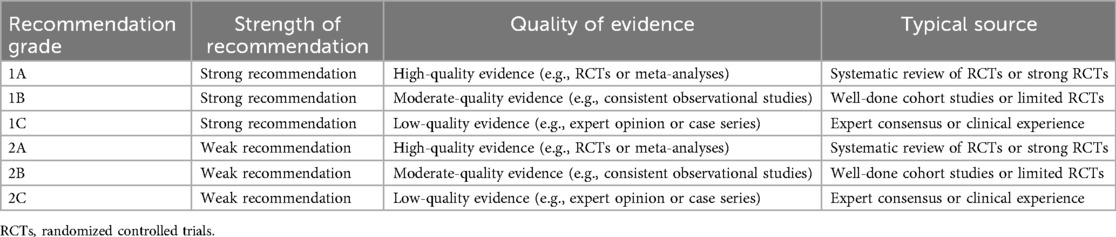 Grade: 1C—Based on expert guidelines and consistent observational data, but limited by the absence of RCTs or high-level comparative studies.