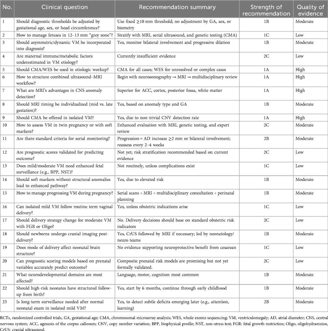 In formulating this expert consensus, recommendations were graded based on the strength of available evidence, clinical consistency, and expert agreement. The grading system is adapted from internationally recognized frameworks such as the GRADE methodology (6), categorizing recommendations as strong (Grade 1) or conditional (Grade 2), and quality of evidence as high (A), moderate (B), or low (C). For example, the recommendation that chromosomal microarray analysis (CMA) be offered to all fetuses with ventriculomegaly—including isolated cases—is graded as 1A, based on multiple cohort studies and meta-analyses demonstrating a substantial diagnostic yield of submicroscopic pathogenic variants (7) (Table 1).
