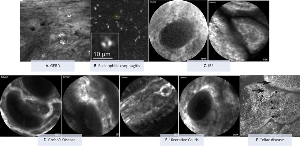 Figure 3. Explanatory pictures of the main applications of confocal Laser endomicroscopy in pediatric gastroenterology. (A) GERD—Image form: Venkatesh K, et al. Gastrointest Endosc 2012 (20) (B) Eosinophilc esophagitis—Image from: Yoo H et al. Gastrointest Endosc 2011 (22). (C) IBS: duodenum (Figure acquired at the Pediatric Gastroenterology and Liver Unit—University Hospital Umberto I, Sapienza University of Rome, Italy). (D) Crohn's disease: mild colonic activity (figures acquired at the Pediatric Gastroenterology and Liver Unit—University Hospital Umberto I, Sapienza University of Rome, Italy). (E) Ulcerative colitis: ileum (left image) and colon (right image) (Figures acquired at the Pediatric Gastroenterology and Liver Unit—University Hospital Umberto I, Sapienza University of Rome, Italy). (F) Celiac disease: duodenal villi with loss of the cellular architecture (large arrows) of the surface epithelium, decrease in goblet cells (arrowheads) and intervillous bridging (small arrows)—Image from: Venkatesh K et al. J Pediatr Gastroenterol Nutr 2010 (28).
