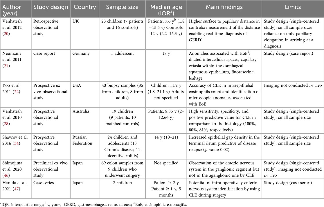 Discussion: Despite the extensive potential of CLE, its application in pediatric patients has been poorly investigated. This narrative review aims to consolidate the current knowledge on CLE in gastrointestinal diseases and to draw insights from adult studies to promote future research in the pediatric field.