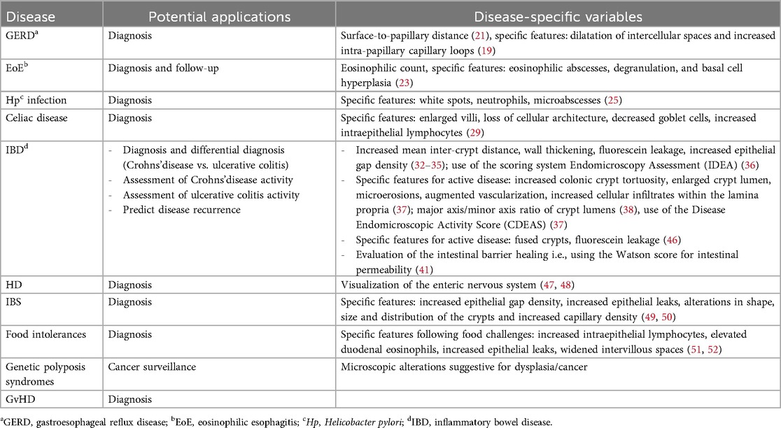 Table 2. Potential applications of confocal laser endomicroscopy (CLE) in pediatric gastrointestinal diseases and disease-specific variables that can be evaluated with CLE.