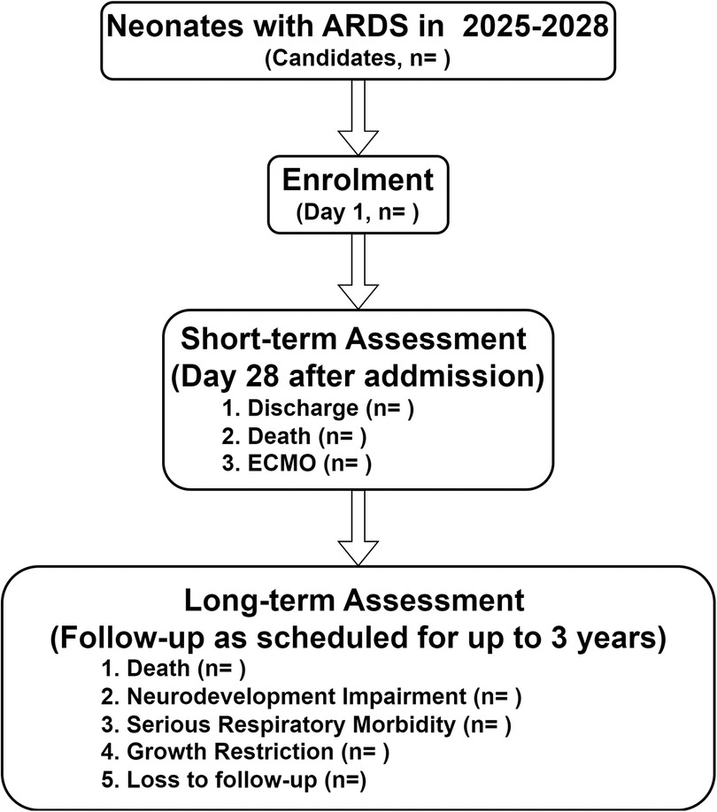 Flowchart outlining the study process for neonates with ARDS from 2025 to 2028. It begins with enrollment on day one. Short-term assessment occurs on day twenty-eight, evaluating discharge, death, and ECMO usage. Long-term assessment includes monitoring for death, neurodevelopmental impairment, serious respiratory morbidity, growth restriction, and loss to follow-up, with scheduled follow-up for up to three years.