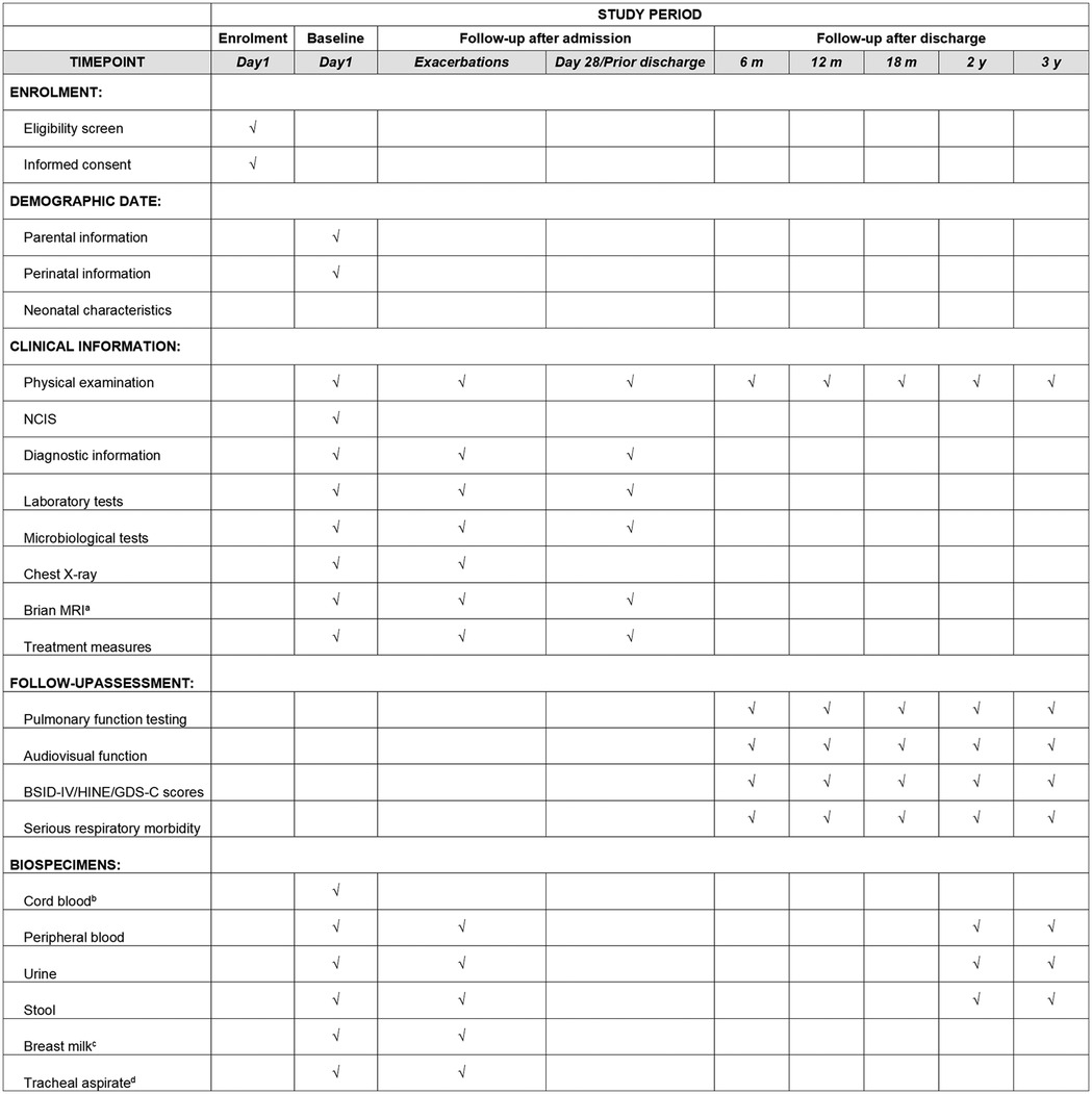 Figure 3. SZ-NARDS protocol time line spans from birth to three years of corrected age collecting health data and biospecimens. (a) MRI date will be collected if the infant is undergoing the procedure; (b) Cord blood, if available, will be bio banked at each participating center; (c) Breast milk samples will be collected if the infant is breastfed; (d) Tracheal aspirate samples will be collected when intubated infants require clinical suctioning. BSID-IV, the bayley scales of infant and toddler development, fourth edition; GDS-C, the griffiths developmental scales-Chinese; HINE, the hammersmith infant neurological examination; MRI, magnetic resonance imaging; NICS, neonatal intensive care severity score.