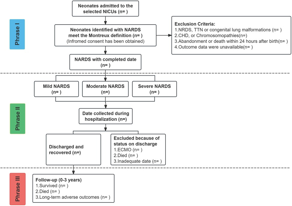 The Montreux definition for NARDS, which was introduced in 2017, signified the initial phase of NARDS research, with a predominant focus on clinical and investigative purposes (6). Following the study protocol, the second phase of this project involves a prospective cohort study with two primary aims: first, to determine the prevalence of NARDS; and second, to characterize the epidemiology, clinical progression, treatment, and outcomes of neonates meeting the Montreux criteria. This methodological approach mirrors the processes followed after the establishment of the Berlin definition of ARDS for adults and the Pediatric Acute Lung Injury Consensus definitions for children (4, 13). However, it is noteworthy that no large-scale international NARDS registry has been established, with only two prospective cohort studies currently available. De Luca et al. (2022) (8) conducted the first international multicenter study, reporting a NARDS prevalence of 1.5% and a mortality rate of 17%–24%. They identified sepsis, aspiration syndromes, and pneumonia as the leading etiologies. Similarly, in 2023, Long Chen et al. (14) conducted a multicenter study in China, which reported a comparable prevalence (1.44%) but a strikingly lower mortality rate (12.6%), with pneumonia, asphyxia, and early-onset neonatal sepsis as the predominant causes. These findings underscore not only regional variations in NARDS prevalence, mortality, and etiological factors, but also reveal a critical clinical paradox: why does NARDS mortality in China appear significantly lower than the international average? Potential explanations for this discrepancy remain unexplored and may include: (1) differences in etiological distributions (e.g., a higher proportion of direct vs. indirect lung injury in Chinese cohorts); (2) variations in clinical management strategies (e.g., surfactant use, ventilation protocols); or (3) demographic factors (e.g., gestational age profiles, access to tertiary care). Resolving this contradiction is essential for refining our global understanding of NARDS pathophysiology and optimizing resource allocation. Nevertheless, a notable limitation in these studies was their emphasis on etiology and short-term outcomes, offering scant insight into the longer-term implications of the condition. To address these gaps, our study undertakes a 3-year, large-scale, multicenter cohort investigation. It will place particular emphasis on the long-term follow-up of patients at high risk of mortality and explicitly aim to dissect the drivers of the observed regional mortality disparity. This will offer a more comprehensive understanding of the natural history of NARDS, thereby expanding the current body of literature and providing mechanistic insights into how the Montreux definition applies across diverse healthcare settings.