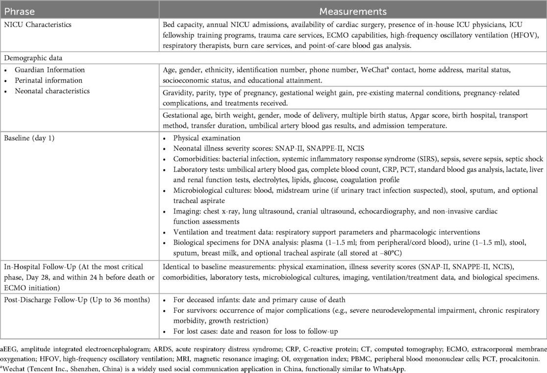The SZ-NARDS registry is a prospective, multicenter, observational cohort study, scheduled to run from January 1, 2025, to December 31, 2028. This study will be conducted across nine tertiary-level NICUs in Shenzhen, China, selected for their infrastructure, expertise in neonatal critical care, and patient volume to represent a broad spectrum of care in the region. The study protocol is reported in accordance with the Strengthening the Reporting of Observational Studies in Epidemiology (STROBE) guidelines (30) (Supplementary Material 1). An overview of the study design is provided in Figure 1.