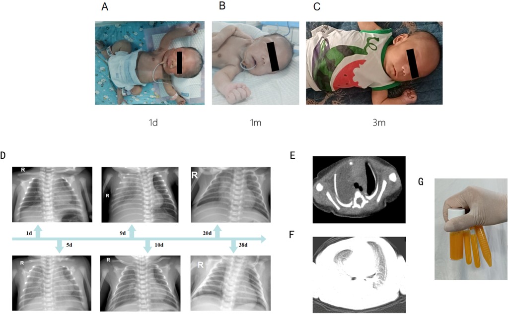 Figure 1. The characteristics of the newborn. (A–C) The characteristics of the newborn's craniofacial dysmorphism. (D) Continuous chest radiographs showed dynamic changes in the condition of the newborn. (E,F) Chest CT on day 9 of admissions demonstrated simple effusion with atelectasis of the right lung. (G) Pleural effusion is yellow chylous liquid.