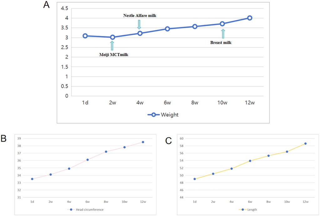 Figure 2. Weight, length, and head circumference were monitored within 3 months after birth. (A) Monitoring of weight in the patient. (B) Monitoring of head circumference in the patient. (C) Monitoring of length in the patient.