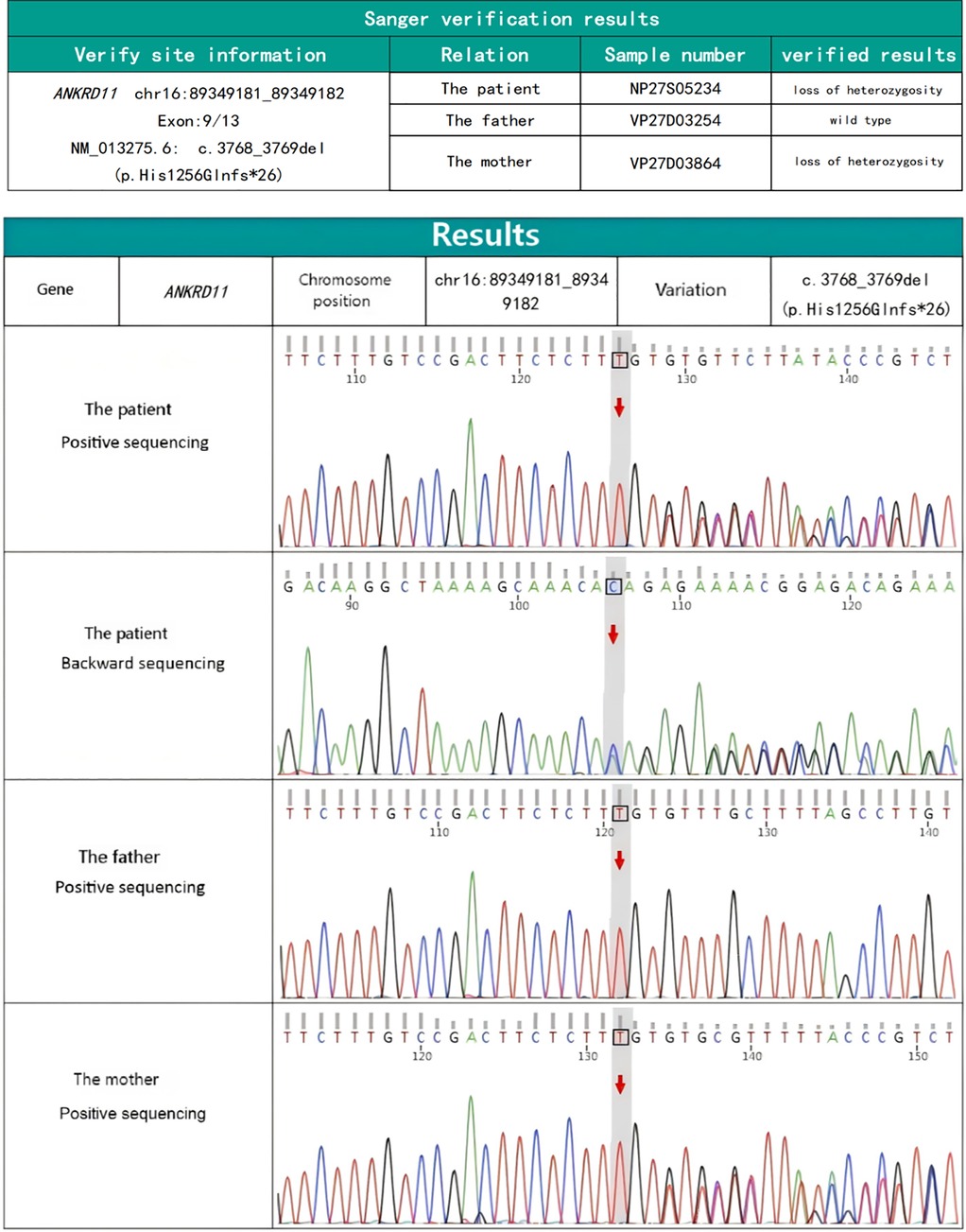 Characteristic craniofacial features together with feeding difficulties, congenital chylothorax and congenital heart disease suggested the possibility of underlying genetically-based syndrome. To better explore the pathogenesis, 2 mL of peripheral venous blood was drawn to analyze cytogenetic and conduct a whole-exome sequencing (WES) (tested by KingMed Diagnostics, China). The chromosomal structure and number were normal as analyzed by karyotype. WES, however, detected a potentially deleterious pathogenic, heterozygous frameshift variant in ANKRD11 gene (NM_013275.6: c.3768_3769del; p.His1256Glnfs*26) (Figure 3). The pathogenic variant was inherited from the mother. The newborn was diagnosed with KBG syndrome based on the revised diagnostic criteria of KBGS established in 2016, in conjunction with the pathogenic variant of the ANKRD11 gene.