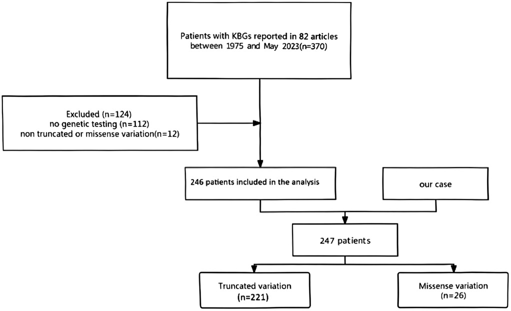 A total of 370 patients were reported in the 82 identified relevant publications. Upon eliminating 124 articles with incomplete genetic information, with only reviews listed in them, or with patients without established truncating or missense changes, 246 case studies fit the strict inclusion criterion (Figure 4). Including the previous patient, this provided a study population of 247 individuals diagnosed with KBGS and confirmed to express pathogenic ANKRD11 variants. Of these, 221 patients had truncating variants (frameshift and nonsense) whereas 26 patients had missense variants.