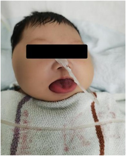 A two-month-old female infant presented with lethargy lasting 2 h and arrhythmia lasting 1.5 h. She had congenital macroglossia, with supine shortness of breath and apnea relieved by lateral positioning. A karyotype genetic analysis performed at another hospital showed a 46, XX karyotype. A brain magnetic resonance imaging (MRI) was performed, revealing no abnormalities in the brain parenchyma. Her tongue was enlarged. A physical examination on admission revealed a body weight of 7.9 kg and height of 61 cm. She was breathing steadily without cyanosis. She displayed no rash. Her facial appearance was symmetrical. She exhibited signs of macroglossia with protrusion beyond the oral cavity (Figure 1). No rales were auscultated in the lungs. Her heart sounds were clear, although her pulse was irregular with a heart rate of 184 beats/min. No murmurs were heard. She had a soft abdomen but a bulging umbilicus that could be retracted. Her liver was palpated 3 cm below the right costal margin and the spleen 2 cm below the left costal margin, both with a soft consistency and well-defined margins.