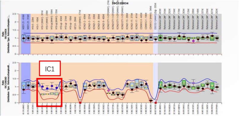 Figure 2. The MLPA assay reported a normal gene copy number on chromosome 11p15.5 but a gain of methylation at IC1.