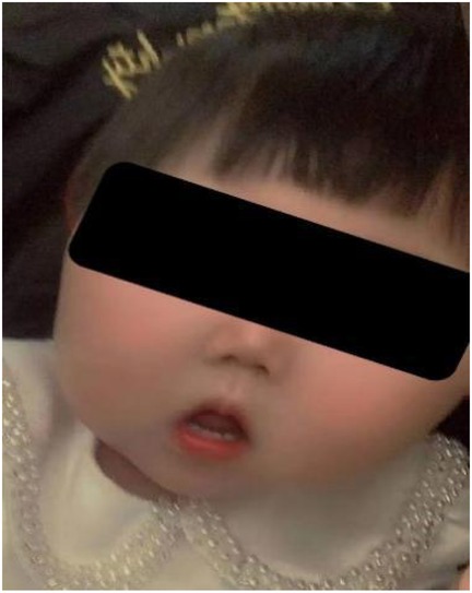 The patient was delivered at full term by cesarean section because of fetal macrosomia. Her mother had experienced two pregnancies with one living child (G2P1). The infant had a history of perinatal hypoxia and neonatal asphyxia. Antenatal polyhydramnios was detected at 28 weeks of gestation; however, data regarding the amount of amniotic fluid after delivery were unavailable. In the mother’s first pregnancy, an induced abortion at 8 weeks of pregnancy was performed because of the absence of fetal heart rate and fetal bud. The patient’s parents were healthy, with no family history of genetic disorders or congenital anomalies.