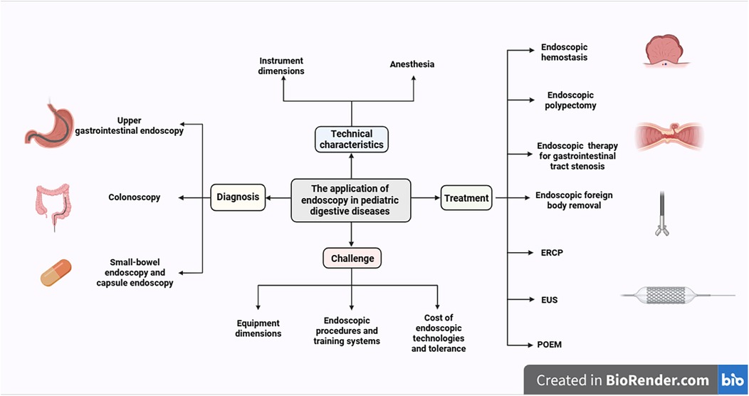 Figure 1. Current applications of gastrointestinal endoscopy in children. (created with BioRender.com).