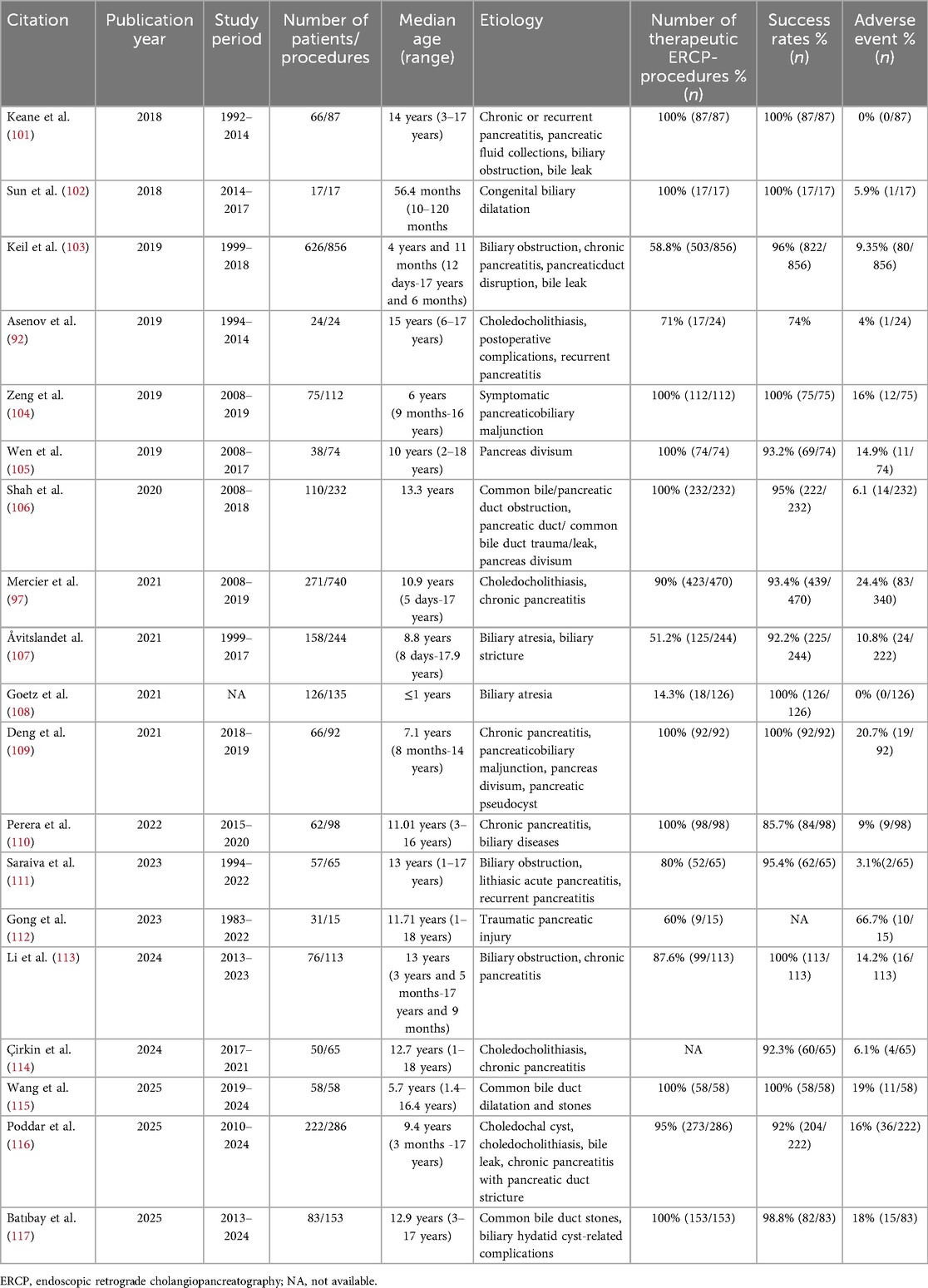 The postoperative adverse event rate is about 7%–8%, with postoperative pancreatitis being the most frequent complication (95, 96). Other rare complications include biliary infection, and bleeding (97, 98). Although intestinal complications are not the most common, they are critically important in ERCP for children, these primarily include intestinal strictures, adhesions, and postsurgical anatomical alterations (98, 99). Such conditions-particularly stenosis or adhesions-can prevent the passage of a standard duodenoscope to the duodenal papilla, increasing the risk of cannulation failure and intestinal perforation. To address these challenges, a comprehensive clinical approach is essential. Preoperative imaging should be used to delineate anatomical details. During the procedure, the selection of specialized equipment—such as smaller-caliber duodenoscopes—should be tailored to the child's weight and the degree of stenosis. In cases of severe stricture, balloon dilation may be considered. Crucially, these procedures should be performed in specialized centers equipped with anesthesiology support for children, onsite surgical backup, and endoscopists experienced in managing complex cases in children to maximize safety and manage potential complications effectively (10). The following summarizes recent results on ERCP in children (Table 1). It should be noted that ERCP in children require general anesthesia (10).