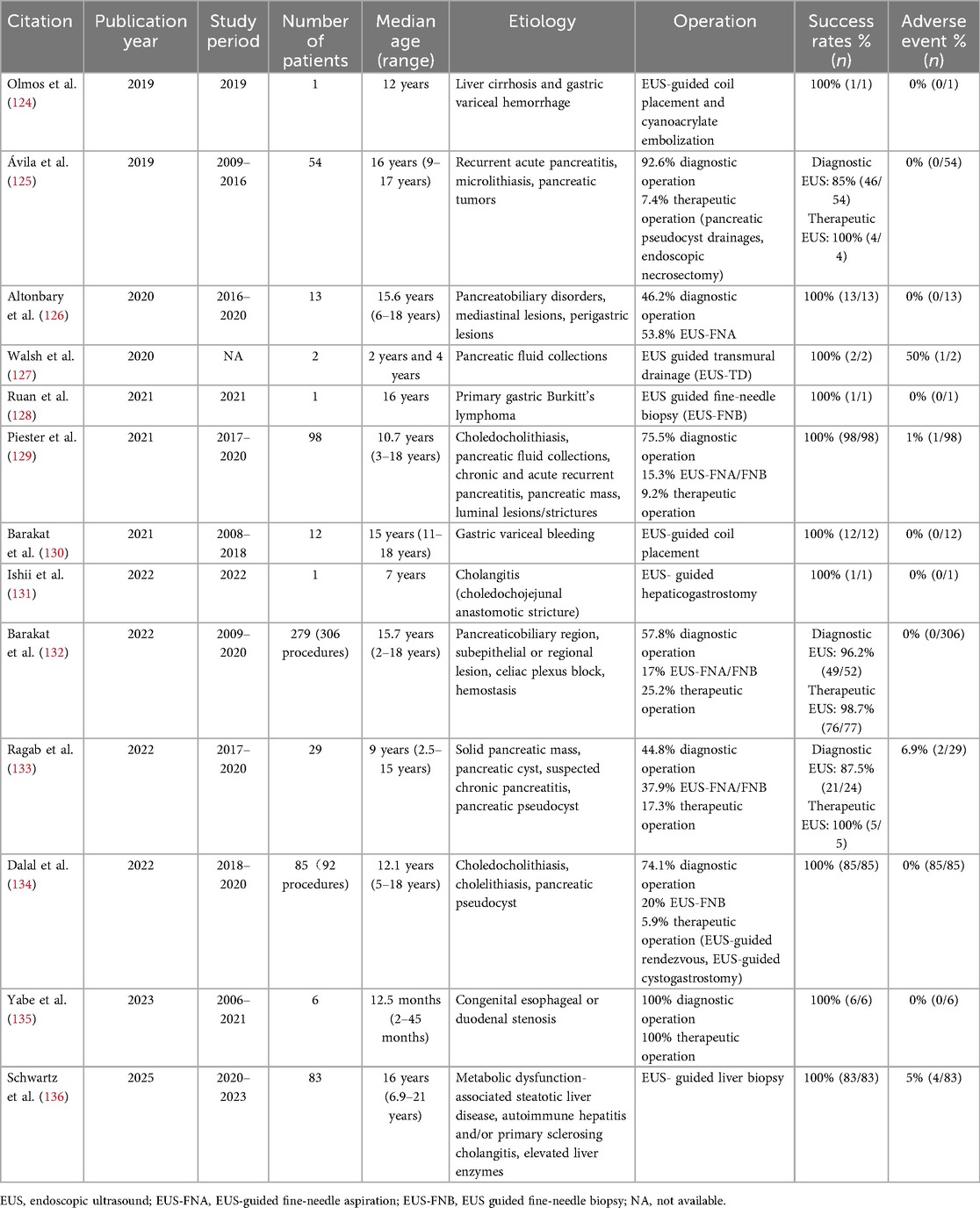 Endoscopic ultrasound (EUS) can clearly delineate pancreaticobiliary structures, with diagnostic performance superior to conventional imaging for chronic pancreatitis, microlithiasis in the biliary tract, and pancreatic pseudocysts, among other conditions (118). Additionally, EUS can be used to guide fine-needle aspiration biopsy, providing histopathological diagnostic confirmation for pancreatic masses and autoimmune pancreatitis (119). In terms of treatment, EUS-guided drainage can be safely performed for children with symptomatic pancreatic pseudocysts, thereby avoiding surgical intervention (120). For children with biliary obstruction, EUS-guided biliary drainage represents an effective alternative, particularly after ERCP failure (119). In children weighing more than 25 kg, adult-endoscopic ultrasound can be safely utilized (121). In smaller children, ultrasound endoscopic probes through standard children endoscope channels may be employed (9, 122). For children weighing more than 15 kg, EUS can be performed safely under intravenous sedation (e.g., propofol) without general anesthesia (119). Infants and young children, due to smaller anatomical structures, may pose greater technical and anesthesia-related challenges (123). The following summarizes recent studies on EUS in children (Table 2). Overall, EUS demonstrates a high technical success rate (118). The complication rate is low, with most adverse events being mild pancreatitis, bleeding, and infection (100, 118).