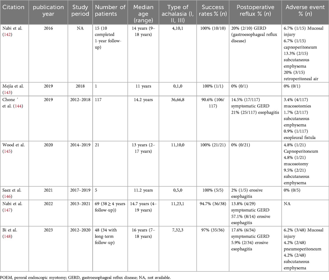 148. Bi Y-W, Lei X, Ru N, Li L-S, Wang N-J, Zhang B, et al. Per-oral endoscopic myotomy is safe and effective for pediatric patients with achalasia: a long-term follow-up study. World J Gastroenterol. (2023) 29:3497–507. doi: 10.3748/wjg.v29.i22.3497