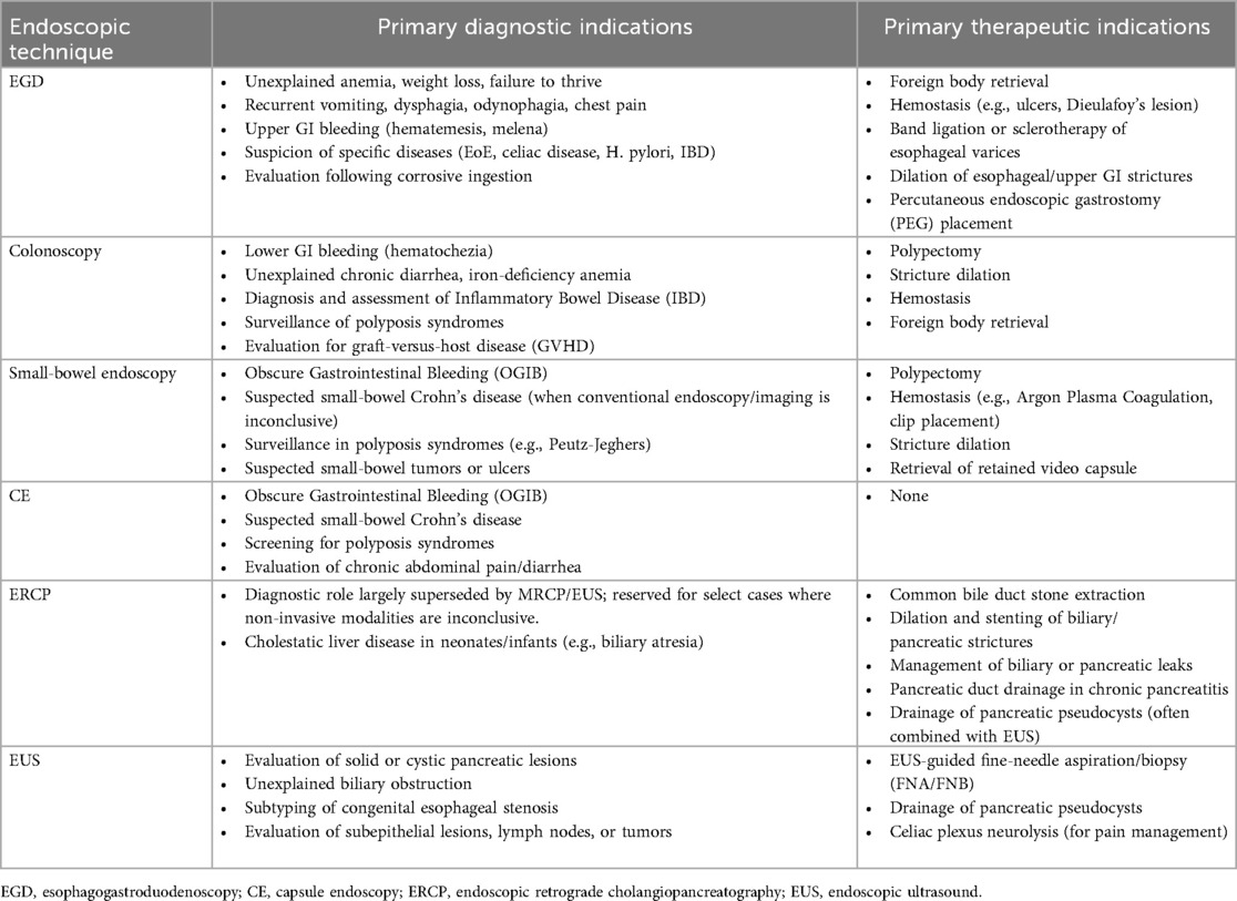 Gastrointestinal endoscopy has become an indispensable tool for diagnosing and treating digestive tract and pancreatobiliary diseases in children. Its application emphasizes the principles of being child-centered, safety-first, and purpose-driven. Gastroscopy and colonoscopy serve as the primary modalities for evaluating mucosal lesions in the upper and lower gastrointestinal tract, providing both diagnostic (e.g., for IBD and EoE) and therapeutic (e.g., polypectomy, hemostasis) functions. For the small intestine, which is beyond the reach of traditional endoscopy, capsule endoscopy offers a non-invasive screening method capable of effectively detecting abnormalities. On this basis, device-assisted enteroscopy allows for further examination and treatment of suspicious lesions. In the field of pancreatobiliary diseases, the role of ERCP has shifted entirely from diagnosis to advanced therapeutic interventions such as stone extraction, stent placement, and drainage. Meanwhile, EUS, with its superior imaging and guided puncture capabilities, plays a crucial role in tumor evaluation, cyst drainage, and other areas. Below is a summary of the diagnostic and therapeutic indications for various types of endoscopy (Table 4) (10, 101, 149).