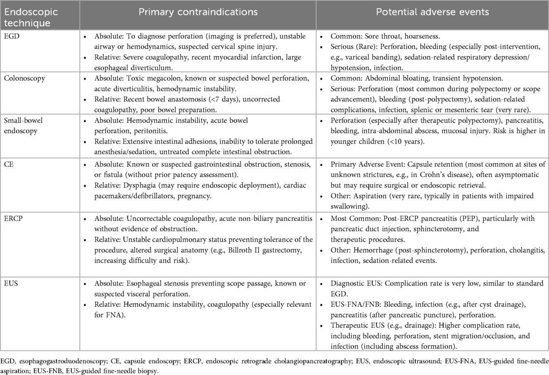 The safety of gastrointestinal endoscopy in children hinges on strict adherence to contraindications and a comprehensive understanding of potential adverse events (Table 5) (10, 101, 149). While diagnostic procedures such as gastroscopy, colonoscopy, and diagnostic EUS are generally safe with rare serious complications, the risk escalates significantly with the invasiveness and complexity of the intervention. High-risk procedures include therapeutic polypectomy via enteroscopy, post-ERCP pancreatitis, and EUS-guided drainage, whereas the foremost risk of capsule endoscopy is retention at an asymptomatic stricture. To maximize patient safety, all endoscopic procedures must be conducted by an experienced endoscopy in children team in a setting equipped with child-specific devices and under appropriate anesthesia and monitoring. Ultimately, rigorous pre-procedural evaluation (including imaging to exclude contraindications), refined technical skill, and diligent post-procedural observation are paramount to preventing and managing adverse events, thereby ensuring that the benefits of gastrointestinal endoscopy outweigh its risks for children.