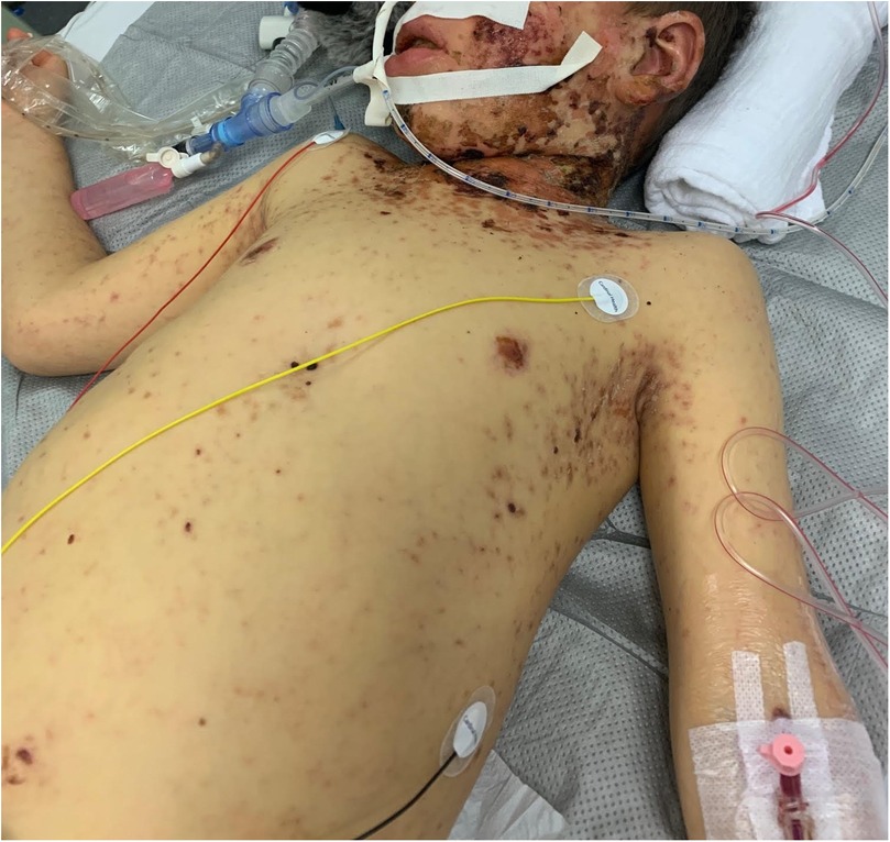 Figure 1. Six-year-old male patient on the seventh day after symptom onset, showing extensive epidermolysis characteristic of Stevens–Johnson syndrome. Published with written parental consent.