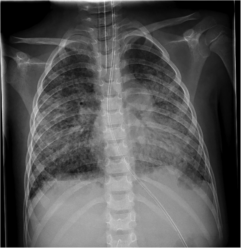 On admission, he showed extensive cutaneous SJS involvement (see Figure 1) and severe respiratory insufficiency [pH 7.29, PaO2 73 mmHg, PaCO2 51 mmHg, FiO2 1.0, positive end-expiratory pressure (PEEP) 15 mbar, peak inspiratory pressure (PIP) 50 mbar]. The calculated oxygenation index was 68, consistent with severe ARDS and meeting ECMO criteria. Chest x-ray demonstrated bilateral diffuse opacification (Figure 2). According to established severity assessment systems, the patient met high-risk thresholds by both the pediatric risk of mortality (PRISM) and pediatric logistic organ dysfunction (PELOD) criteria, reflecting multiorgan stress but preserved cardiac function. Broad microbiological and virological testing yielded negative results, and genetic as well as immunological work-up was unremarkable.