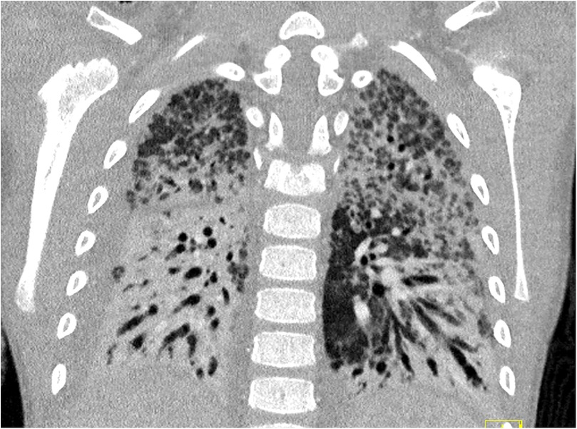 Rapid deterioration of the patient’s condition required initial VV-ECMO via a 19F bicaval double-lumen Avalon cannula, which was later supplemented by a femoral cannula due to recirculation. Lung-protective ventilation was applied. Adjunctive treatment included repeated intrapulmonary surfactant administration to improve alveolar recruitment as this therapy option has been reported to improve lung compliance and restore surfactant homeostasis (11); however, this treatment was discontinued after three applications due to the high cost and lack of result in our case. Corticosteroid therapy following the Meduri protocol was applied to modulate persistent inflammation and prevent fibroproliferative progression of ARDS (12, 13). Angiotensin-converting enzyme (ACE) inhibitor therapy was introduced to target pulmonary remodeling and fibrosis, as angiotensin-converting enzyme 2 (ACE2) is involved in the regulation of lung injury and repair pathways (14).