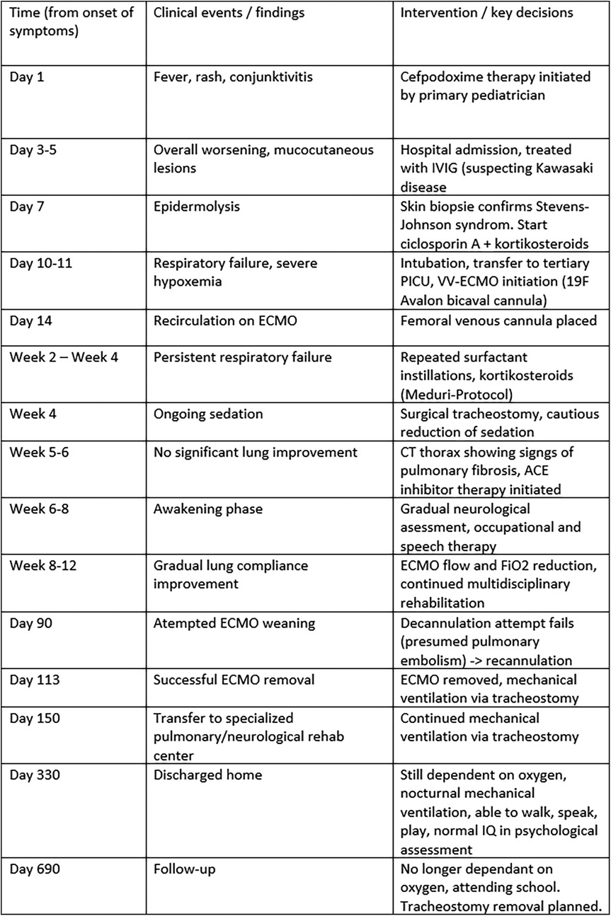 Figure 4. Clinical timeline summarizing major events from symptom onset to 18-month follow-up. The table displays the chronological sequence of key clinical events (left column), corresponding findings (middle column), and major interventions or management decisions (right column) throughout the patient's course. PICU, pediatric intensive care unit; IVIG, intravenous immunoglobulin; VV-ECMO, veno-venous extracorporeal membrane oxygenation; PEEP, positive end-expiratory pressure; PIP, peak inspiratory pressure; F, French size (outer diameter of the cannula).