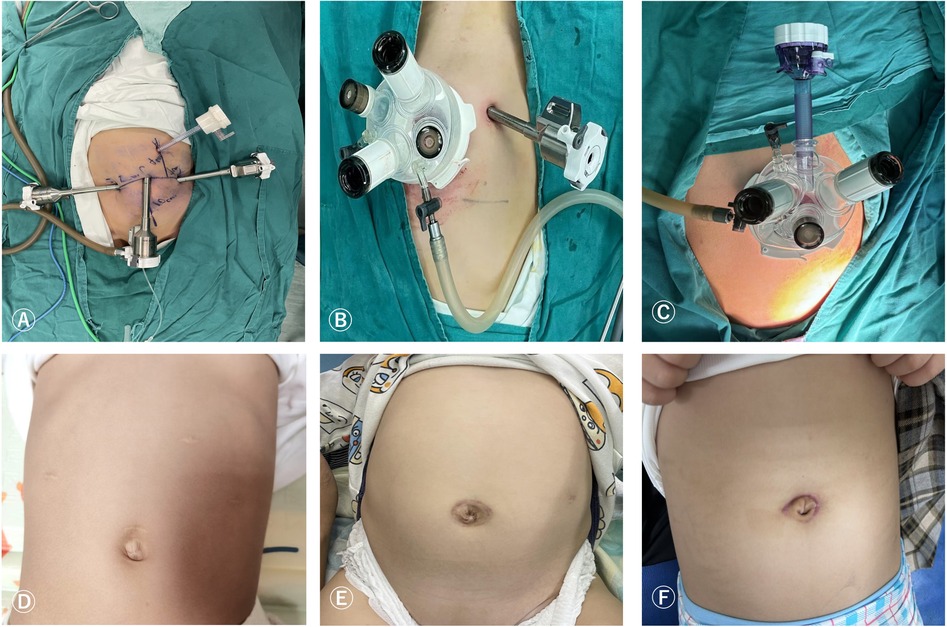In order to reduce the harm to children and minimize the size and number of incisions, we have continuously improved our technology. Our robot assisted laparoscopic technology has undergone a transformation from multiple ports to single-port-plus-one (8, 9). With the accumulation of previous experience, we have now achieved the application of single-port technology in the treatment of common pediatric urinary system deformities, including POM. The impact of different perforation methods on the appearance and efficacy of postoperative wounds in children is not yet clear. In this study, we evaluated the short-term and long-term effects of three perforation methods on POM children by collecting and comparing clinical data from three groups of children.