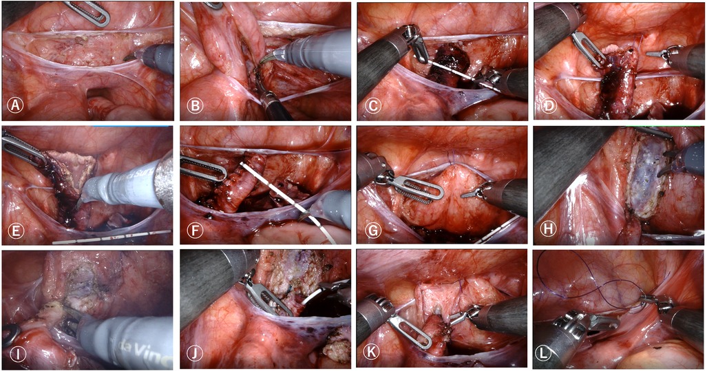 Each group takes the above-mentioned incision method and establishes pneumoperitoneum (pressure 8–12 mmHg, flow rate 3–5 L/min). Connect each operating hole to the robotic arm, enter the abdominal cavity, open the outer peritoneal fold of the bladder (Figure 2A), directly identify the free ureter on the anterior outer side of the vas deferens or uterine artery, bluntly separate the surrounding structure, separate the ureter downwards to the bladder connection (Figure 2B), measure the width of the dilated ureter (Figure 2C), disconnect the ureter near the bladder, remove the narrow segment of the ureter, suspend and cut the dilated ureter (Figures 2D,E), suture the ureter to form and re measure the width of the ureter (Figure 2F), insert a 4-0 line above the pubic symphysis outside the abdominal cavity, suspend the bladder to the abdominal wall (Figure 2G), insert sterile physiological saline through a catheter, fill the bladder, measure the length of the bladder plasma muscle layer incision and mark it, generally 4–5 times the width of the ureter after cutting and forming, open the bladder serosa layer, and at a distance of 1.5 cm from the end of the ureter (Figure 2H). Using 6-0 Polydioxanone Suture at the 6 o'clock and 12 o'clock positions, Intermittent suturing of the ureteral seromuscular layer and the entire bladder wall, followed by 4 stitches in each quadrant to complete direct nipple implantation at the end of the ureter and insertion of a double-J tube (Figures 2I,J). From bottom to top, intermittently suture the ureter and detrusor muscle to form a ureteral tunnel, embedding and suturing the ureter between the bladder muscle layers (Figure 2K).Cut off the suspension traction line, clean the wound with warm physiological saline, wash away the intra-abdominal fluid, confirm no active bleeding or leakage, and suture the peritoneum (Figure 2L). Evacuate the pneumoperitoneum and all robotic arm operating instruments, close the pneumoperitoneum, and suture the incision layer by layer.