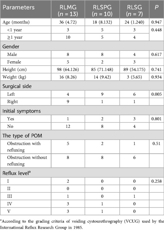 No significant differences were observed among the three groups in demographic characteristics, including age, gender, height, weight, or initial symptoms (P > 0.05). All groups had children under the age of 1, with 3 child in RLMG, 5child RLSPG, and 3 child in RLSG, with no significant intergroup difference (P = 0.448). A significant difference was noted in the distribution of surgical sides (P = 0.005), with the majority of left-sided POM cases being in the RLSPG (9/10) and RLSG (6/7) groups, while the RLMG group had a predominance of right-sided cases (9/13). The majority of POM cases were classified as “obstruction without refluxing”, with 8 cases in RLMG, 8 case in RLSPG, and 6 case in RLSG, with no significant intergroup difference (P = 0.51). Among the reflux levels indicated by VCUG examination showed higher prevalence of grades IV–V across groups, though without statistical significance (P = 0.258) (Table 1).