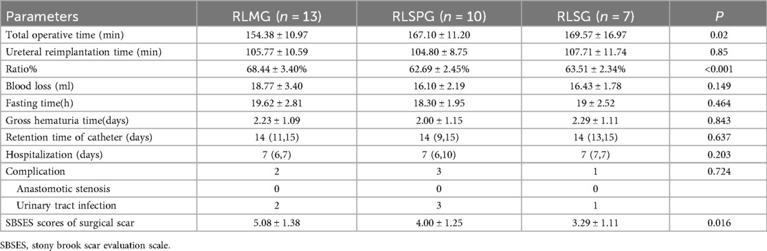 There was a significant difference in the total surgical time among the groups (P = 0.02), with RLMG group (154.38 ± 10.97 min) being significantly shorter than RLSPG group (167.10 ± 11.20 min) and RLSP group (169.57 ± 16.97 min), but there was no significant difference between RLSPG group and RLSP group (P = 0.721). However, the time for ureteral reimplantation in the abdominal cavity of the three groups was roughly the same (P = 0.85), with RLMG group taking 105.77 ± 10.59 min and RLSPG group taking 104.80 ± 8.75 min, and RLSG taking 107.71 ± 11.74 min. There was a significant difference in the ratio of ureteral reimplantation time to total surgical time among the three groups, with RLMG accounting for a significantly higher ratio than RLSPG and RLSG (P < 0.001). Blood loss, fasting time, catheter retention time, hospitalization days, postoperative complication rates (including urinary tract infections) showed no significant differences (P > 0.05). There were no other complications after surgery except for urinary tract infection. There were 2 cases in RLMG, 3 case in RLSPG, and 2 case in RLSG who developed urinary tract infection within 1 months after surgery. All cases were treated conservatively, and there was no recurrence after removing the double-J tube. There were significant differences in Surgical scar evaluation (SBSES scores) among the groups (P = 0.016), with RLSG group significantly higher than RLSG group (P = 0.009) and higher than RLSPG group, but the difference was not statistically significant (P = 0.244) (Table 2).