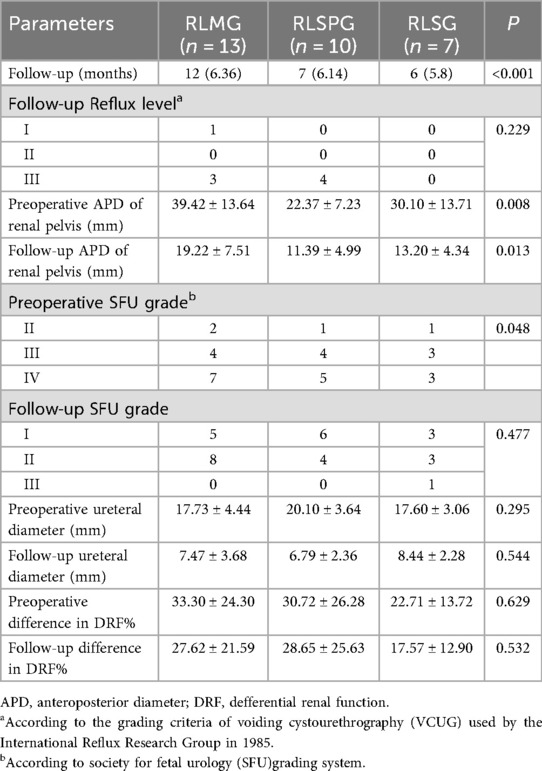 The RLMG had the earliest implementation time and the longest follow-up time, the median follow-up duration 12(6.36) months was longest, with significant intergroup variation (P < 0.001). As summarized in Table 3, APD, ureteral diameter, SFU grade and difference in DRF showed a significant reduction at the last follow-up compared to preoperative values in all three groups (P < 0.001), confirming the relief rate of obstruction in all three groups was 100%. The preoperative anteroposterior diameter (APD) and maximum ureteral diameter are as follows: for the RLMG group, 39.42 ± 13.64 mm and 17.73 ± 4.44 mm; for the RLSPG group, 22.37 ± 7.23 mm and 20.10 ± 3.64 mm; for the RLSG group, 30.10 ± 13.71 mm and 17.60 ± 3.06 mm. The preoperative SFU grading was mainly grade IV (7 cases in RLMG group, 5 cases in RLSPG group, and 3 cases in RLSG group), and the proportion of grade I-II significantly increased during postoperative follow-up (P = 0.048). In children with preoperative POM type of obstruction with refluxing, most reflux disappeared after surgery. Only one child in the RLMG group had grade 5 reflux on the affected side preoperatively, which remained as grade 3 reflux postoperatively. The RLMG and RLSPG groups experienced new reflux on the affected side after surgery, with the RLMG group having 1 case of grade 1 reflux and 2 cases of grade 3 reflux, while the RLSPG group had 4 cases of grade 3 reflux. No reflux was observed in the RLSG group based on the current follow-up results.