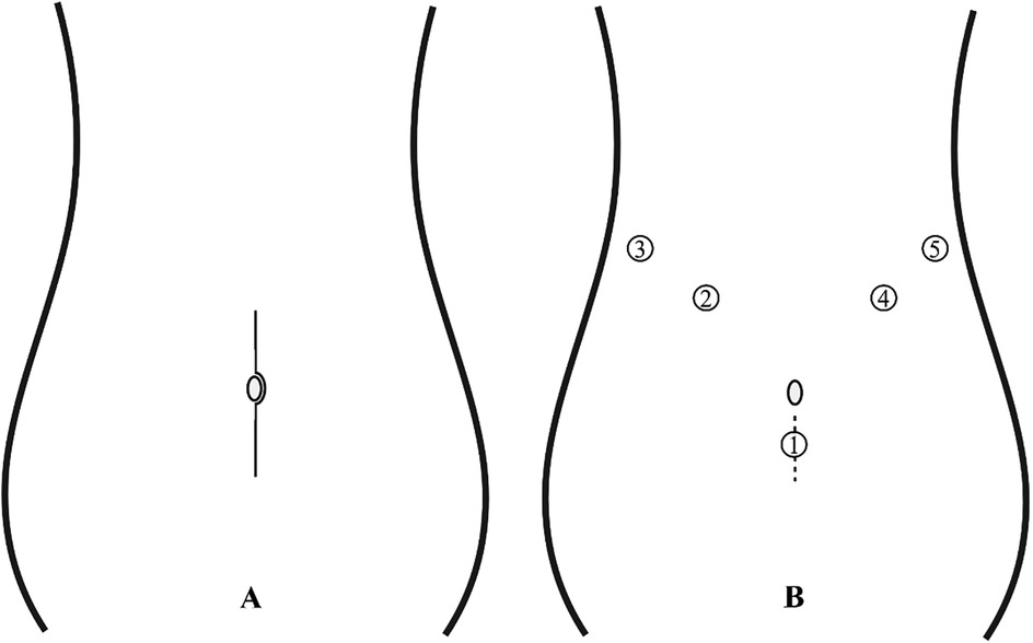 Figure 1. (A) Open surgical incision: a length of 12–15 cm. (B) Trocar placement for laparoscopic surgery: 1: Endoscope; 2: Operating forceps; 3-5: Assistant port; The dashed line in the figure denotes the extended incision made for tumor extraction, approximately 3–5 cm in length.