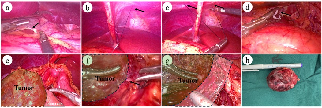 Figure 2. Intraoperative images of laparoscopic surgery: (a) arrow indicates: division of the hepatogastric ligament. (b–c) Arrows indicate: Puncture and placement of a 2-0 suture with needle at the subxiphoid abdominal wall. (d) Fixation of the suture midpoint to the hepatogastric ligament posterior to the stomach. (e) Complete exposure of the pancreas and pancreatic tumor. (f) Arrow indicates: Clear laparoscopic visualization of the tumor's feeding vessels. (g) Demonstration of the interface between the tumor and normal pancreatic tissue. (h) Postoperative tumor specimen: Complete tumor resection.