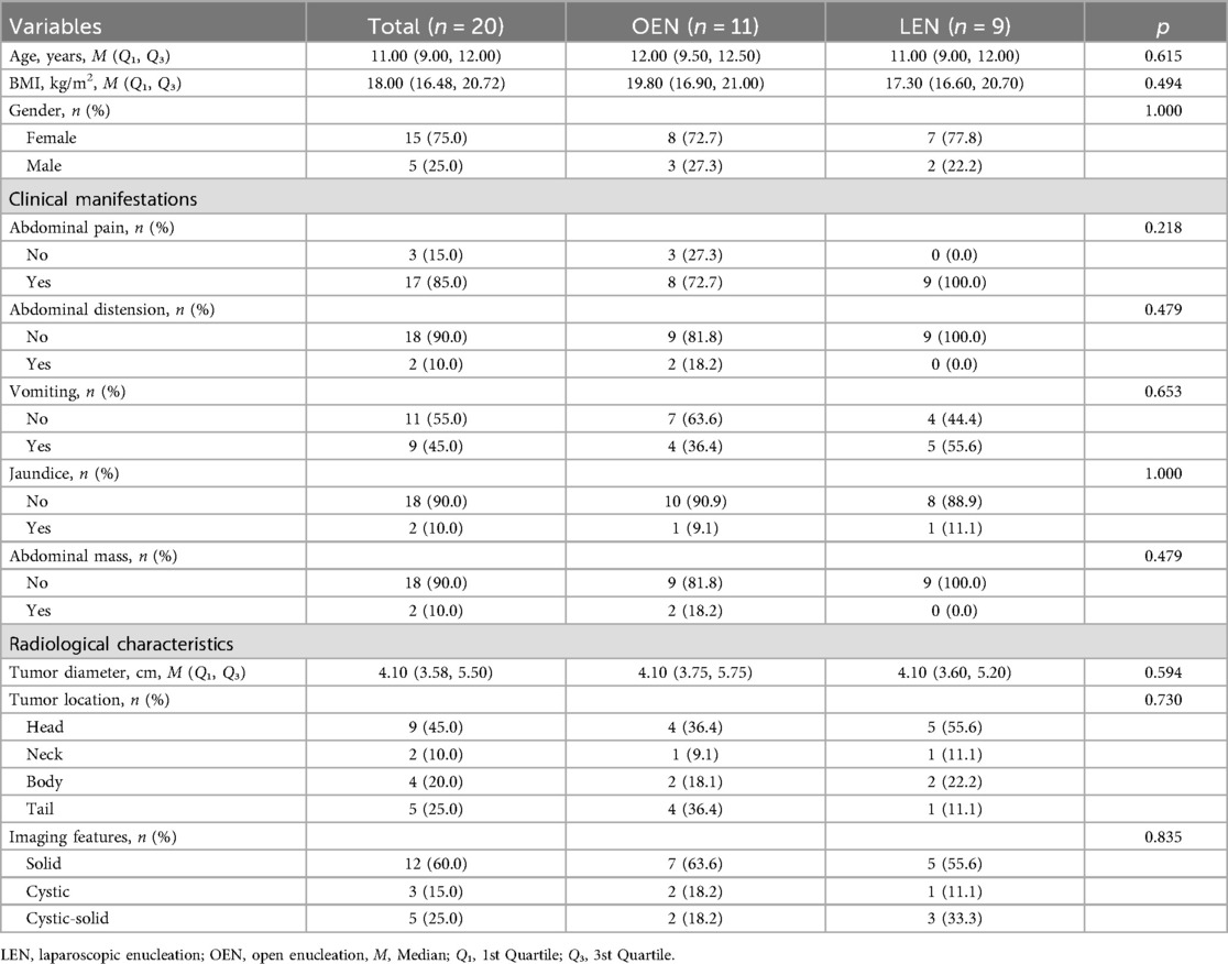 This study included 20 pediatric patients with SPN, with 9 undergoing LEN and 11 undergoing traditional OEN. Baseline characteristics revealed a median age of 11 years, a female predominance of 75.0%, and a median BMI of 18.00 kg/m2. Preoperative clinical manifestations were primarily abdominal pain (17/20, 85.0%), followed by vomiting (9/20, 45.0%), with bloating, jaundice, and abdominal mass being less common (2/20, 10.0%). Imaging findings showed a median tumor diameter of 4.10 cm, with tumors most frequently located in the pancreatic head (9/20, 45.0%), followed by the tail (5/20, 25.0%), body (4/20, 20.0%), and neck (2/20, 10.0%). Radiologically, solid tumors predominated (12/20, 60.0%). No significant differences were observed between the OEN and LEN groups for these parameters (Table 1).