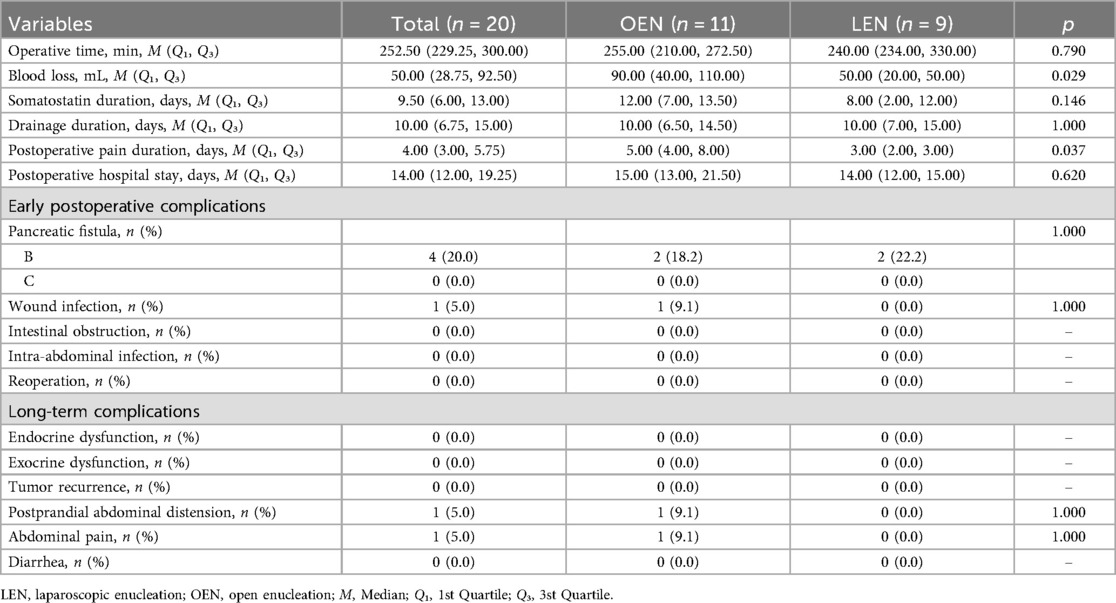 Preventing pancreatic fistulae and optimizing their management are crucial for enucleation procedures. This study found comparable overall pancreatic fistula rates between LEN and OEN, with no statistical difference. However, literature indicates that laparoscopic techniques, with their high-definition visualization and facilitation of precise anatomical dissection, can significantly lower pancreatic fistula rates (4.5%) (23). This advantage likely stems from laparoscopy's superior precision in dissection and hemostasis. Protection of the main pancreatic duct is paramount, as tumors <2–3 mm from the duct increase the risk of intraoperative injury (22). For patients with deeply located tumors <2 mm from the main pancreatic duct, preoperative endoscopic retrograde cholangiopancreatography (ERCP) with pancreatic duct stent placement to mark and protect the duct, or intraoperative ultrasound to locate the duct, is recommended (25, 26). During enucleation of tumors close to the main pancreatic duct, meticulous dissection is essential to avoid injury. Furthermore, pancreatic surgery wound management affects pancreatic fistula incidence. Our center employed open drainage, placing drainage tubes around the pancreas and subhepatic region, with postoperative monitoring of drain amylase levels and output to determine removal timing. The median drainage tube removal time was 10 days post-surgery. Among the 20 patients, four developed grade B pancreatic fistulae, all effectively managed with prolonged drainage, total parenteral nutrition, and somatostatin therapy. To address the issue of postoperative pancreatic fistula and its impact on hospital stay, we recommend that thorough preoperative assessment is essential, utilizing advanced imaging modalities such as enhanced computed tomography (CT), magnetic resonance imaging (MRI), and magnetic resonance cholangiopancreatography (MRCP) to evaluate the relationship between the tumor and the main pancreatic duct. Tumors located within 3 mm of the main pancreatic duct are considered a risk factor for postoperative pancreatic fistula, and we have avoided enucleation in such cases. Our center plan to routinely incorporate intraoperative ultrasound in future surgeries to enhance tumor localization and to measure the distance between the tumor and the main pancreatic duct. This technique also helps in assessing the integrity of the main pancreatic duct (2). Additionally, our center plan to place pancreaticobiliary stents during enucleation, as previous studies have shown that stent placement can reduce the risk of injury to the main pancreatic duct and common bile duct. We will maintain our current practice of open drainage to facilitate the drainage of pancreatic exudate and to monitor for pancreatic fistula. Furthermore, early postoperative measures are equally critical, including ensuring adequate drainage, preventing infection, and administering somatostatin analogs to reduce pancreatic juice secretion.