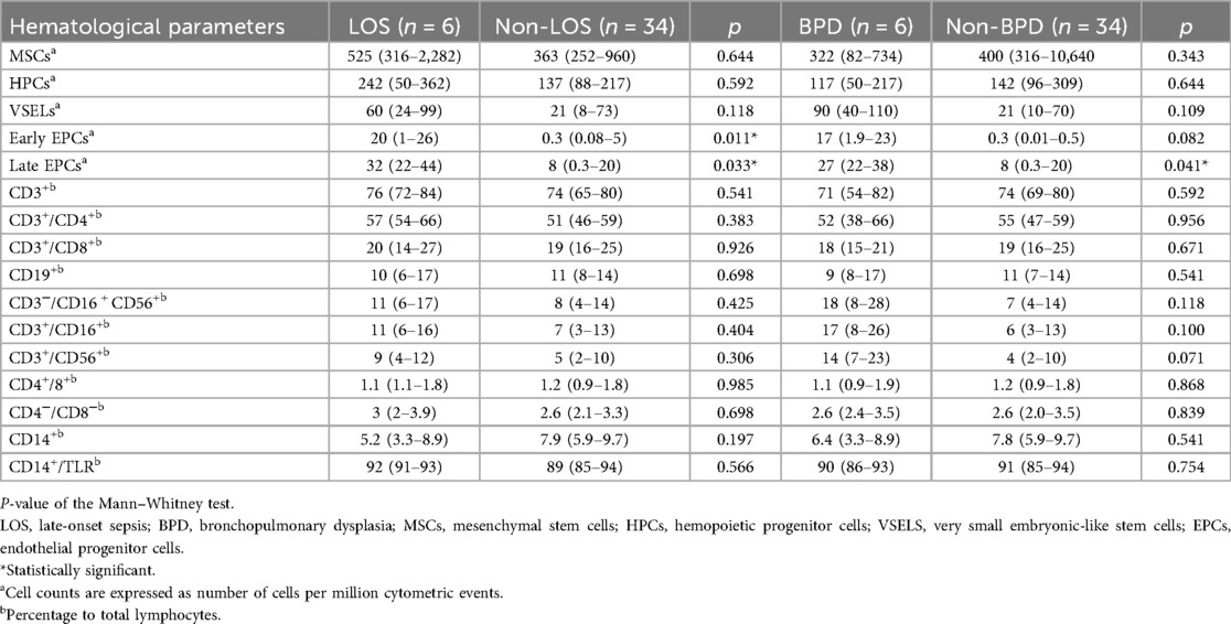 Continuous variables were expressed as median (interquartile range, IQR). The normality of the distributions of continuous variables was assessed by the Shapiro–Wilk test. Comparisons of continuous variables between the DCC and ICC groups, as well as between neonates with and without late-onset sepsis, and neonates with and without BPD were performed utilizing the non-parametric Mann–Whitney test. Categorical variables were expressed as n (percentage %) and compared between the DCC and ICC groups with the chi-square test or Fisher's exact test. Since the MSCs, HPCs, VSELs, early EPCs, late EPCs, and the immunophenotype were not normally distributed, the comparisons of those parameters within each group between the first, 10th, and 30th day of life were performed with the Friedman test with post hoc analysis with the Bonferroni correction.
