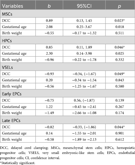 Table 5. Linear regression analysis of the association between DCC and MSCs, HPCs, VSELs, early and late EPCs, adjusted for gestational age and birthweight.